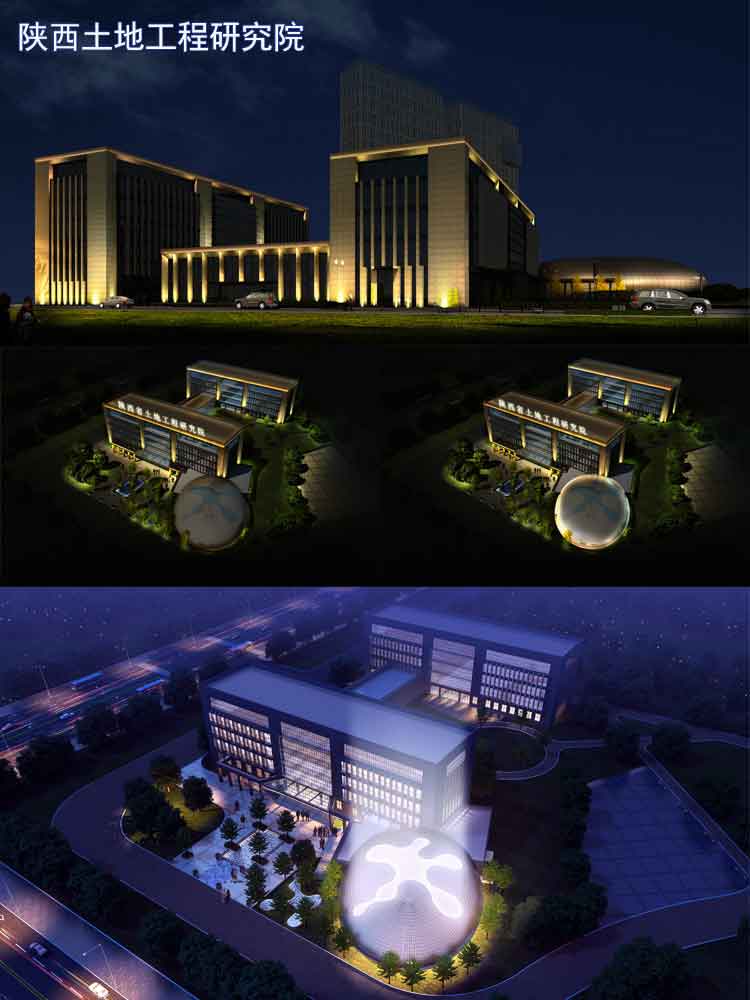簡介—— 陜西土地工程研究院是承擔(dān)各類建設(shè)工程勘察、設(shè)計(jì)、土建、安裝、市政、石化、公路、地鐵、機(jī)場、礦山、核電、裝飾、鋼結(jié)構(gòu)、古建園林工程施工。對(duì)于設(shè)計(jì)院辦公樓體亮化設(shè)計(jì),公司設(shè)計(jì)師跟根其前后樓體的建筑和廣場的球狀建筑的特點(diǎn),采用簡單的洗墻燈和投光燈來進(jìn)行效果設(shè)計(jì),彰顯建筑的大氣與威嚴(yán)。