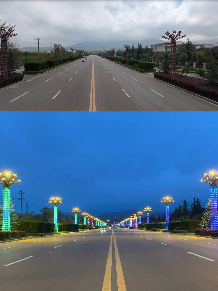 簡介—— 甘肅平?jīng)?米景觀燈項目,安裝位于崆峒山下的市政道路倆側(cè),主光源采用16個LED模組光源組成,配合燈體400的RGB點光源構(gòu)成,系統(tǒng)采用512控制,夜晚整體趁現(xiàn)炫彩效果,亮化倆側(cè)道路。