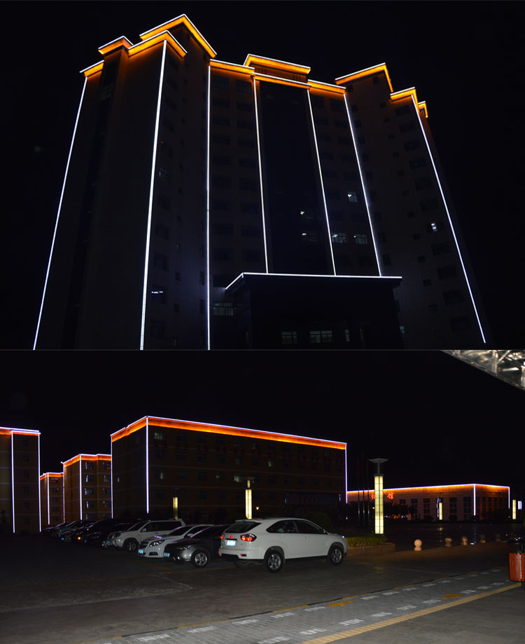 銅川建新煤化是我公司承接的廠區(qū)亮化工程之一,該項(xiàng)目整體從設(shè)計(jì)到施工,全程有我公司承擔(dān)負(fù)責(zé),設(shè)計(jì)根據(jù)甲方的要求,采用簡潔明了的線條勾勒輪廓和打亮為主。在廠區(qū)主要的辦公樓、餐廳、員工活動(dòng)中心、員工福利中心、員工宿舍樓等員工主要活動(dòng)的場(chǎng)所樓進(jìn)行重點(diǎn)亮化。