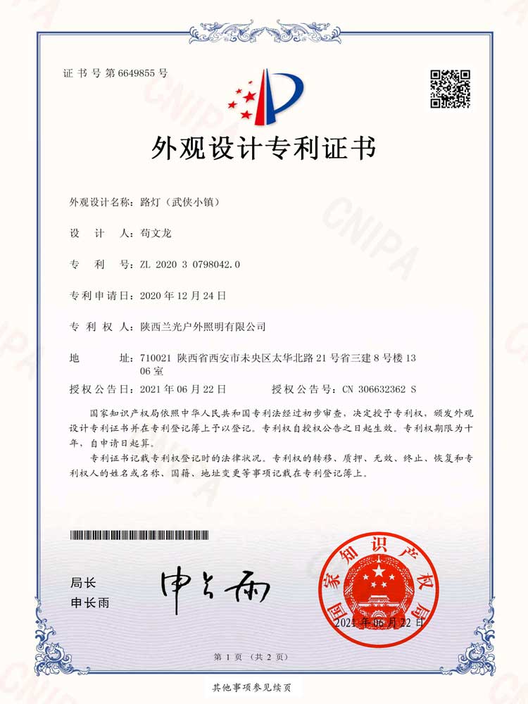 簡(jiǎn)介—— 設(shè)計(jì)名稱:武俠小鎮(zhèn)景觀燈 設(shè)計(jì)用途:園林、景觀照明 專利種類:外觀設(shè)計(jì) 專利號(hào):ZL 2020 3 0798042.0